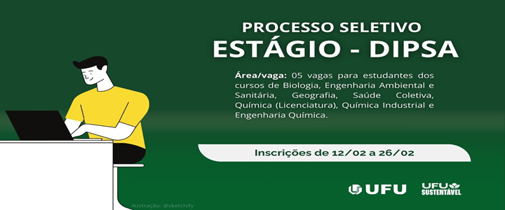 A Divisão de Planejamento Socioambiental (DIPSA), vinculada à Diretoria de Sustentabilidade (DIRSU) da Prefeitura Universitária (PREFE) da Universidade Federal de Uberlândia (UFU) torna público o edital para contratação de estagiários(as). As vagas são destinadas a estudantes regularmente matriculados nos cursos de Ciências Biológicas, Engenharia Ambiental e Sanitária, Geografia, Saúde Coletiva, Química (Licenciatura), Química Industrial e Engenharia Química.